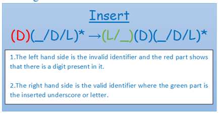 Insert: This method is used only when there is digit(s) present at the start of the input string. Inserting character (namely L/_) at the of the string can make it a valid identifier.