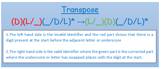 Transpose: This method works only when there is a single digit present at the start of the string followed by a letter or underscore. Transposing or interchanging two adjacent characters at the first and second places make the string a valid identifier.