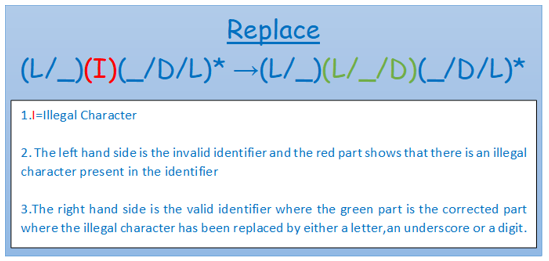 Replace: This method works by changing the illegal characters to a letter or digit or underscore making the string a valid identifier.